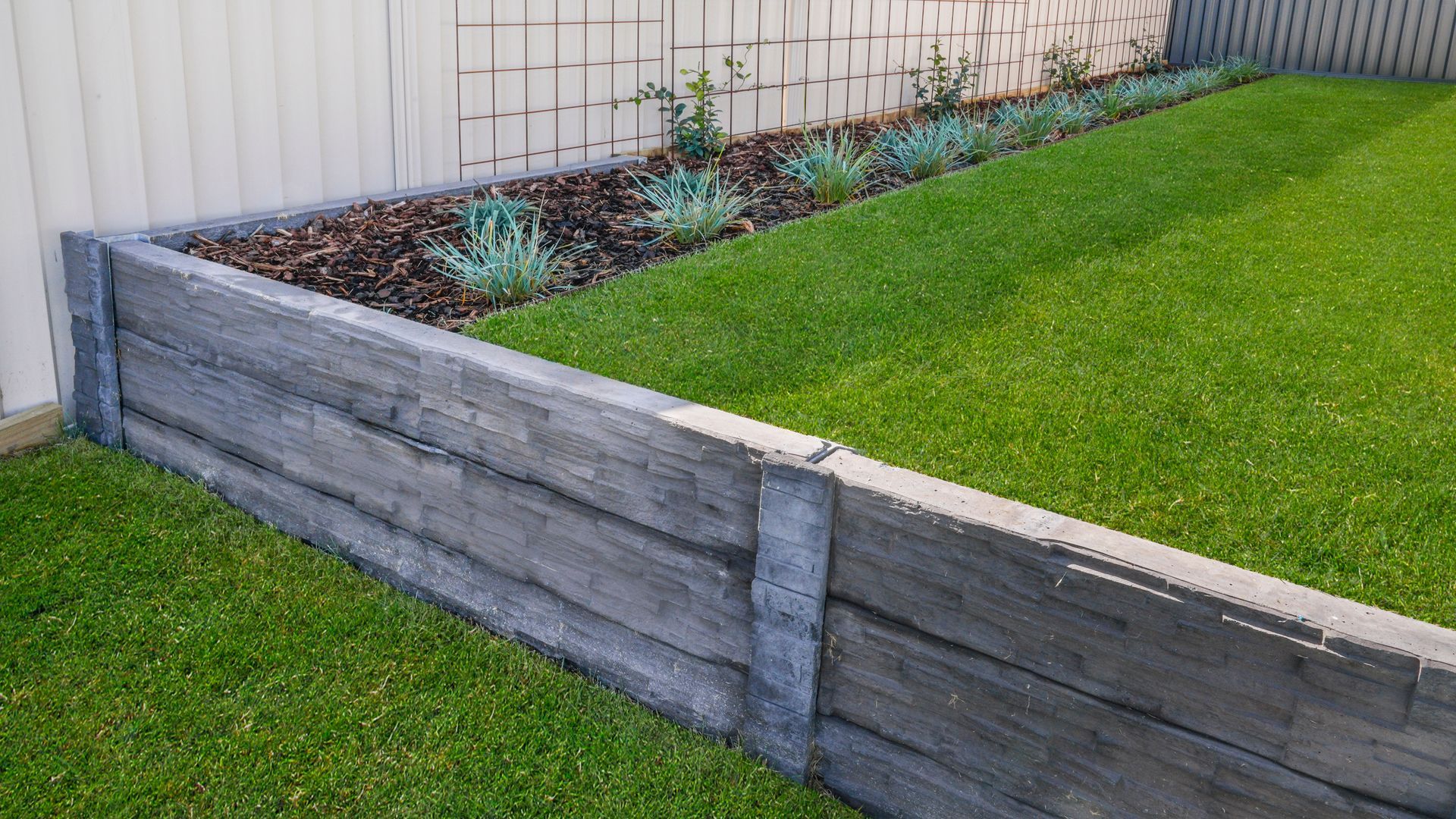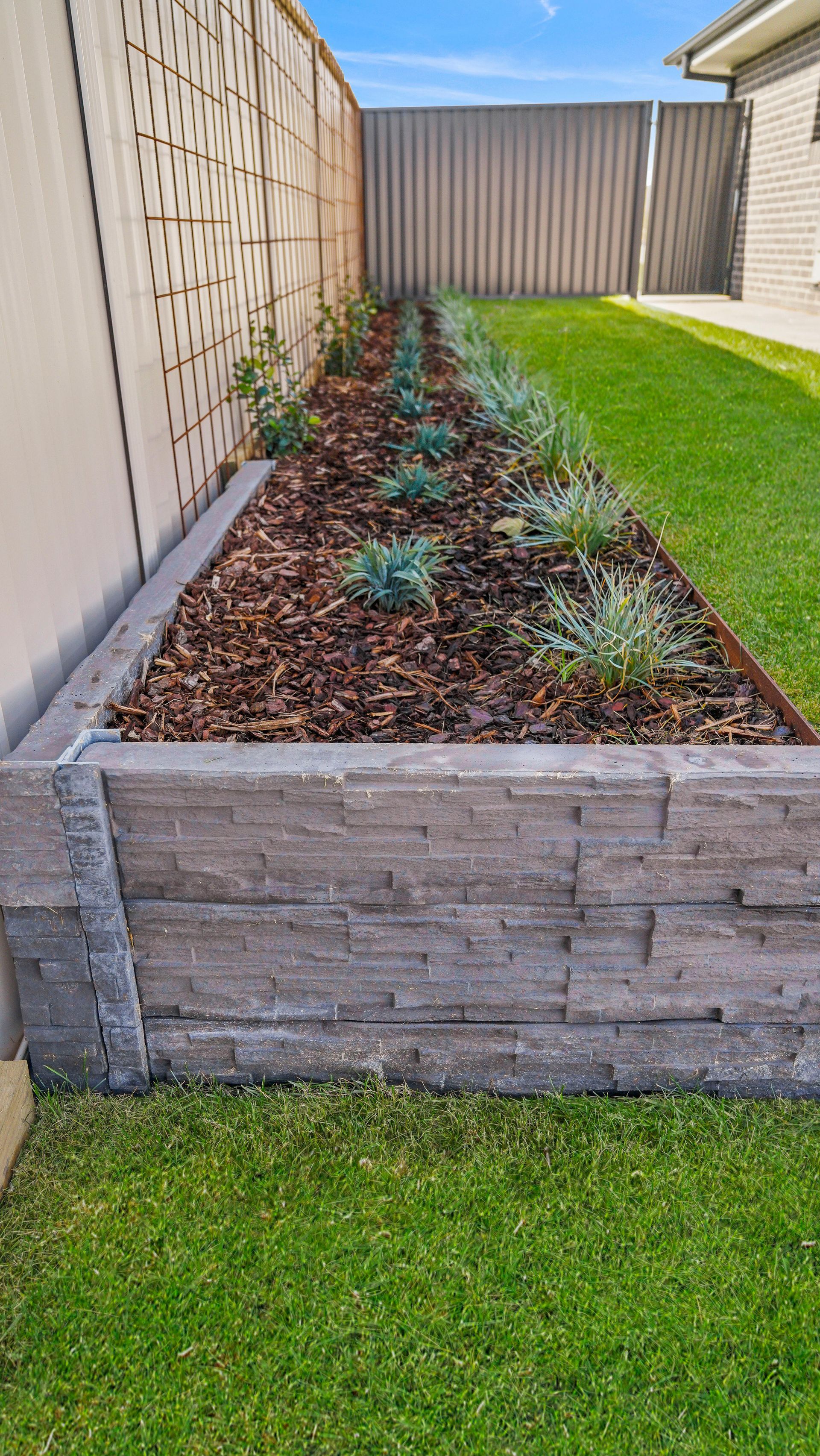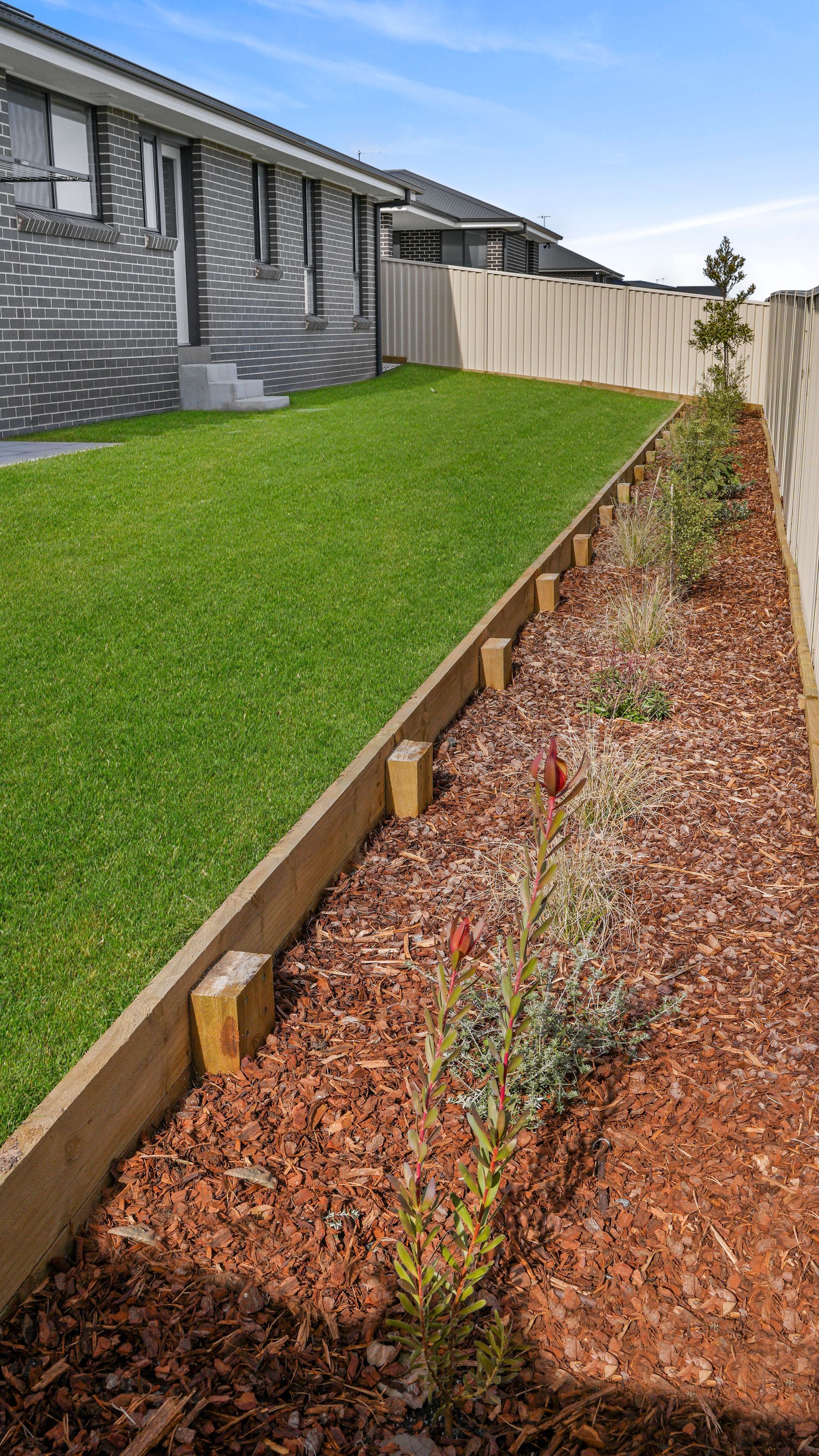 Formal landscape construction in Bathurst NSW- concrete sleeper retaining walls, native-exotic garden beds and manicured lawn
