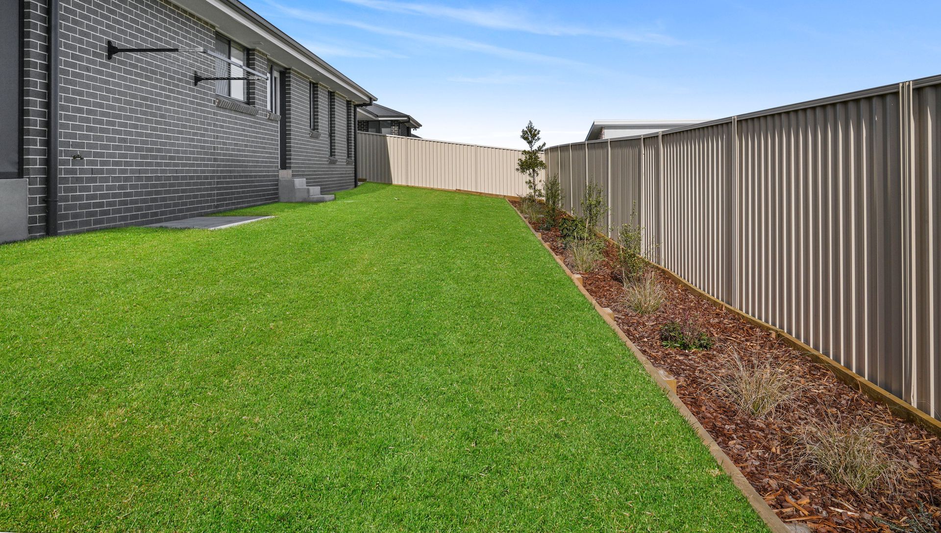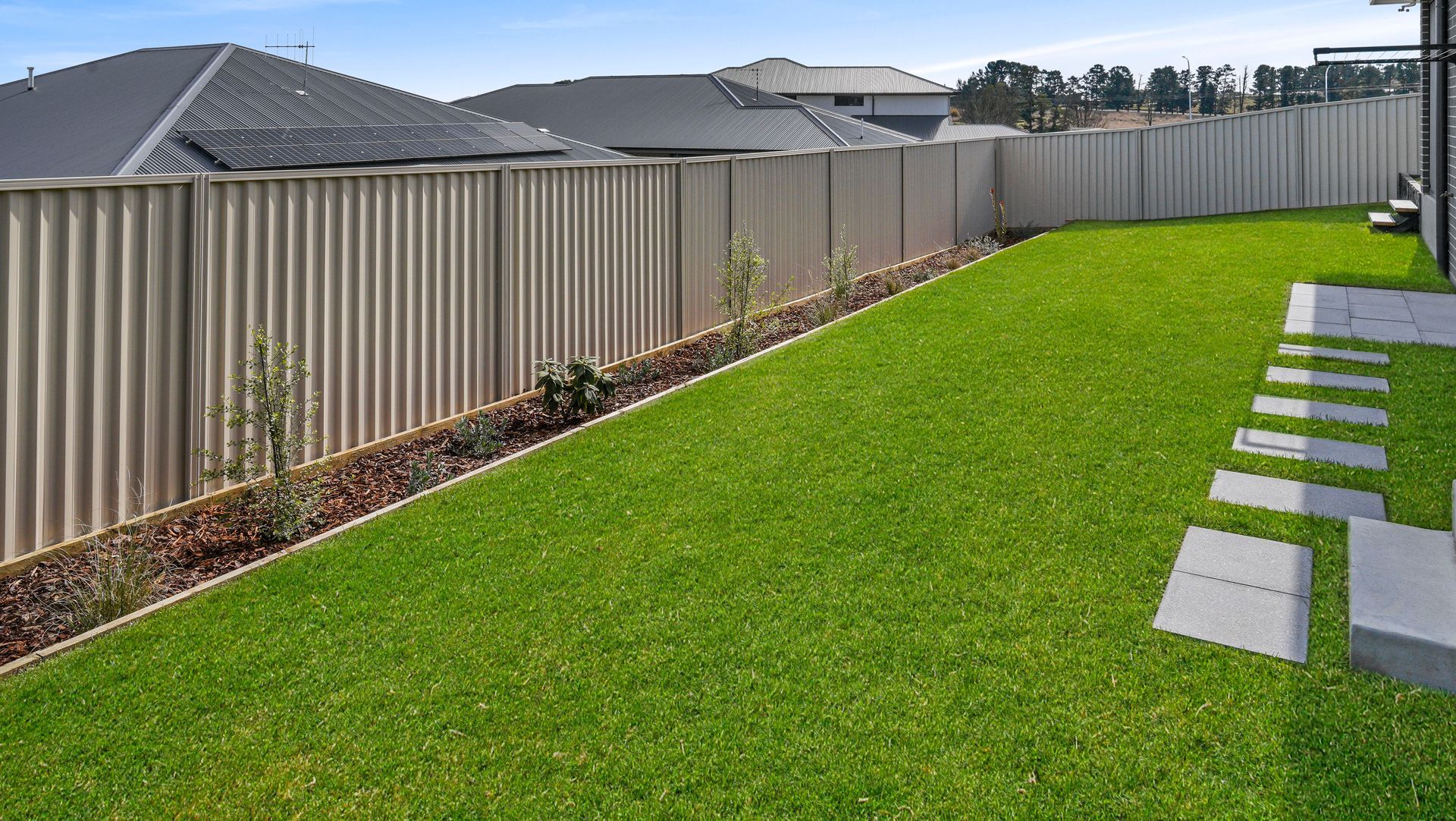 Modern landscape design and construction in Bathurst NSW- manicured lawn with native-exotic garden bed plantings